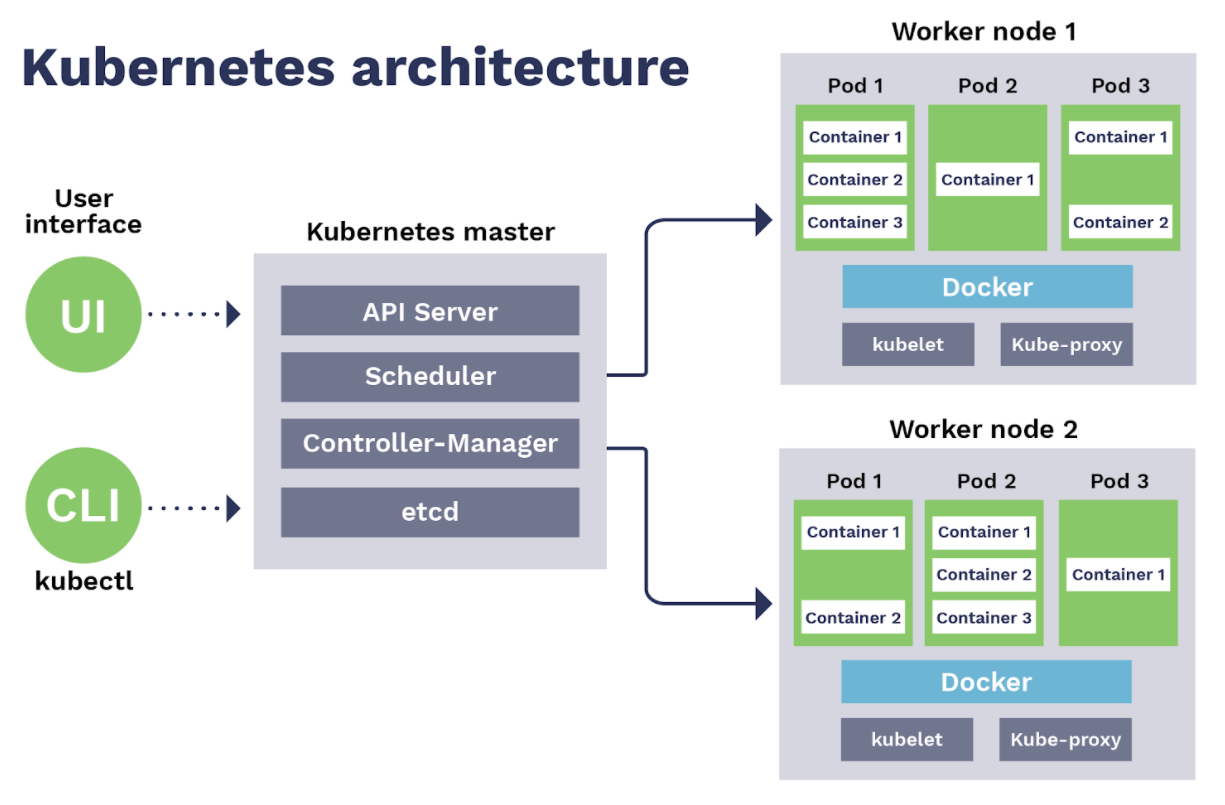 Окей, надеваем перчатки и полезли под капот: Представим, что у нас есть несколько серверов, на которых нужно развернуть наше приложение при помощи кубернетеса. Такое объединение серверов мы назовем кластером, а каждый отдельный сервачок внутри кластера назовем нодой Ноды мы логически разделим на два типа - это Мастер (Master) нода, этакий мозг нашего кластера, который будет управлять всеми остальными, и рабочие лошадки - Воркер (Worker) ноды, на них как раз будут запущены контейнеры с сервисами нашей апликухи. Еще ту часть с мозгами называют Control Plane (Control Plane), а часть где крутится приложения - Data Plane (Data Plane). Рассмотрим магистра йоду, ой, сорри, мастер ноду. Тут работает несколько процессов, нужные для запуска и управления всего кластера. Первый компонент мастер ноды - API Server. По сути это наш способ взаимодействия с кластером. Если нужно что - то сделать, то запрос идет в этот компонент. Следом идет Controller Manager. Роль этого джентльмена в наблюдении за всем кластером, проверке все ли в порядке, а если что - то не так - ему надо принимать меры. У Controller Manager есть план, которого все в кластере должны придерживаться - такой план называется “Желаемое состояние” (desired state), то есть то, как все должно работать в идеале, и задача контроллера всегда приводить текущее состояние (current state) к желаемому. Кстати, есть разные типы контроллеров, каждый из которых отвечает за узлы, реплики, токены, ну и так далее. Следующий компонент - планировщик (Scheduler). Как ты мог догадаться - он планирует. Планирует то, как расположить контейнеры на различных нодах кластера в зависимости от различных факторов, таких как загруженность ноды и доступность серверных мощностей на ней. Ну и наконец etcd (е ти си ди) - это хранилище данных в виде ключ-значение (key-value). Здесь хранится важная информация, которая отражает текущее состояние кластера: конфигурационные данные, статусы наших нод и контейнеров ну и так далее. Если что - то упадет, то эти данные помогут быстро восстановить систему. Ну вот, теперь ты понял, насколько важна мастер нода. Ну и как говорится, “Two is One and One is None” (“Два это один, один это ничто”) - так что не поленись всегда создавать резервную мастер ноду для отказоустойчивости. Переходим к обычным работягам - воркер нодам. Именно здесь сосредоточена вся мощь нашего кластера, ведь тут будут крутится наши контейнеры. У воркера три основных компонента. Первый - кублет (kubelet). Он отвечает за общение с мастером, получая инструкции что и как должно работать на этой конкретной ноде. А еще он общается со вторым компонентом - с исполняемой средой контейнера (container runtime), которая отвечает за образы контейнеров, их запуск и остановку, а также управление их ресурсами. Ну и финально, третий компонент - кьюб прокси (kube-proxy). Он выполняет сетевую роль - отвечает за коммуникацию и балансировку внутренней сети. Так, ладно, это все конечно хорошо, а где сами контейнеры то запускаются? И тут у нас появляется такая штука, которая называется под. Под (pod) - это минимальный элемент кумбера, с которым мы можем взаимодействовать. Именно в нем и запускается наш контейнер. Откровенно говоря, это некая обертка над ним. Обычно, в одном поде крутится один контейнер, но если нам по какой-то причине нужно засунуть туда больше чем один, например, когда приложению нужны доп. контейнеры для работы, то можно так сделать - это вполне лега